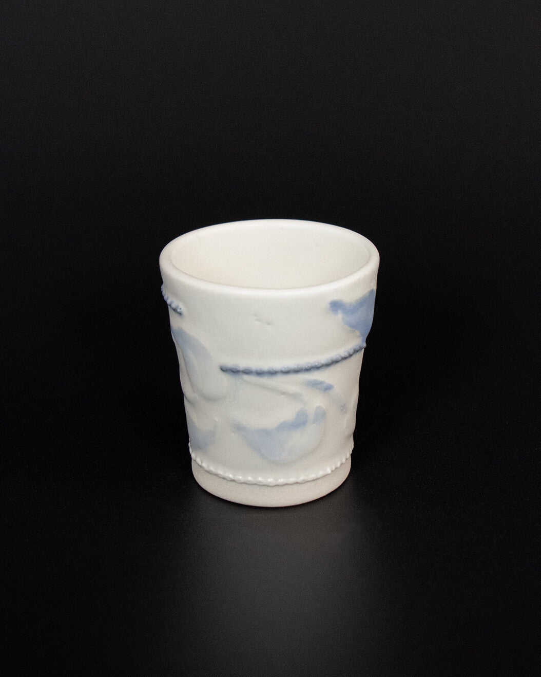Thrown porcelain decorated with water etching, slip trailing, and white glaze.